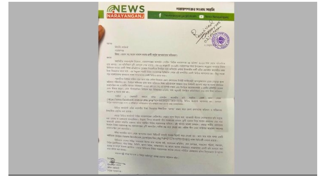 নারায়ণগঞ্জ-৪ আসনে বিএনপি জোট সমর্থিত জমিয়তে উলামায়ে ইসলামের প্রার্থী মুফতি মনির হোসাইন কাসেমীর ছবি সম্বলিত একটি ফ্যানপেজে অপপ্রচারের অভিযোগে রিটার্নিং কর্মকর্তাকে লিখিত দিয়েছে অনলাইন নিউজ পোর্টাল “নিউজ নারায়ণগঞ্জ”।