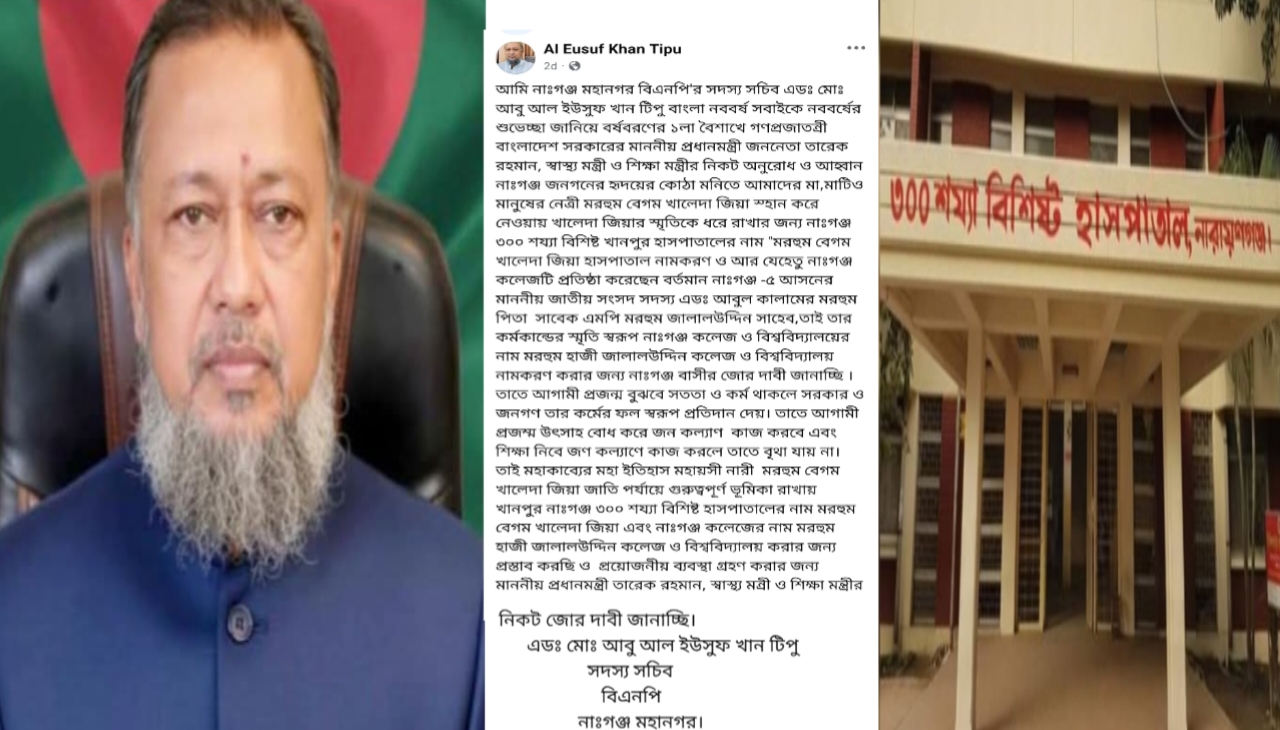 তার ষ্ট্যাটার্সটি হুবহু তুলে ধরা হলো:-আমি নাঃগঞ্জ মহানগর বিএনপি'র সদস্য সচিব এডঃ মোঃ আবু আল ইউসুফ খান টিপু বাংলা নববর্ষ সবাইকে নববর্ষের শুভেচ্ছা জানিয়ে বর্ষবরণের ১লা বৈশাখে গণপ্রজাতন্রী বাংলাদেশ সরকারের মাননীয় প্রধানমন্ত্রী জননেতা তারেক রহমান, স্বাস্থ্য মন্ত্রী ও শিক্ষা মন্ত্রীর নিকট অনুরোধ ও আহ্বান নাঃগঞ্জ জনগনের হৃদয়ের কোঠা মনিতে আমাদের মা,মাটিও মানুষের নেত্রী মরহুম বেগম খালেদা জিয়া স্হান করে নেওয়ায় খালেদা জিয়ার স্মৃতিকে ধরে রাখার জন্য নাঃগঞ্জ ৩০০ শয্যা বিশিষ্ট খানপুর হাসপাতালের নাম "মরহুম বেগম খালেদা জিয়া হাসপাতাল নামকরণ ও আর যেহেতু নাঃগঞ্জ কলেজটি প্রতিষ্ঠা করেছেন বর্তমান নাঃগঞ্জ -৫ আসনের মাননীয় জাতীয় সংসদ সদস্য এডঃ আবুল কালামের মরহুম পিতা সাবেক এমপি মরহুম জালালউদ্দিন সাহেব,তাই তার কর্মকান্ডের স্মৃতি স্বরূপ নাঃগঞ্জ কলেজ ও বিশ্ববিদ্যালয়ের নাম মরহুম হাজী জালালউদ্দিন কলেজ ও বিশ্ববিদ্যালয় নামকরণ করার জন্য নাঃগঞ্জ বাসীর জোর দাবী জানাচ্ছি ।তাতে আগামী প্রজন্ম বুঝবে সততা ও কর্ম থাকলে সরকার ও জনগণ তার কর্মের ফল স্বরূপ প্রতিদান দেয়। তাতে আগামী প্রজম্ম উৎসাহ বোধ করে জন কল্যাণ কাজ করবে এবং শিক্ষা নিবে জণ কল্যাণে কাজ করলে তাতে বৃথা যায় না।তাই মহাকাব্যের মহা ইতিহাস মহায়সী নারী মরহুম বেগম খালেদা জিয়া জাতি পর্যায়ে গুরুত্বপূর্ণ ভূমিকা রাখায় খানপুর নাঃগঞ্জ ৩০০ শয্যা বিশিষ্ট হাসপাতালের নাম মরহুম বেগম খালেদা জিয়া এবং নাঃগঞ্জ কলেজের নাম মরহুম হাজী জালালউদ্দিন কলেজ ও বিশ্ববিদ্যালয় করার জন্য প্রস্তাব করছি ও প্রয়োজনীয় ব্যবস্থা গ্রহণ করার জন্য মাননীয় প্রধানমন্ত্রী তারেক রহমান, স্বাস্থ্য মন্রী ও শিক্ষা মন্ত্রীর নিকট জোর দাবী জানাচ্ছি।