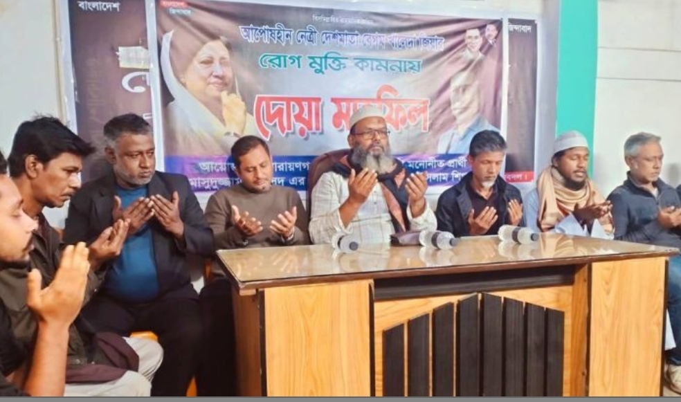 গণতন্ত্রের 'মা' বাংলাদেশ জাতীয়তাবাদী দল বিএনপির চেয়ারপারসন ও সাবেক তিনবারের প্রধানমন্ত্রী বেগম খালেদা জিয়ার সুস্থতা ও রোগমুক্তি কামনায় নারায়ণগঞ্জ -৫ আসনের বিএনপির ধানের শীষের মনোনীত প্রার্থী মাসুদুজ্জামানের পক্ষে দোয়া ও মিলাদ মাহফিল অনুষ্ঠিত হয়েছে।