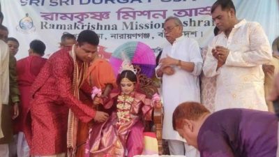 নারায়ণগঞ্জে শারদীয় দুর্গোৎসবের অষ্টমীতে জাঁকজমকপূর্ণভাবে অনুষ্ঠিত হয়েছে কুমারী পূজা। মঙ্গলবার (৩০ সেপ্টেম্বর) সকাল ১১টায় ঢাকঢোল ও শঙ্খধ্বনির মধ্য দিয়ে শহরের রামকৃষ্ণ মিশন আশ্রমে এ পূজা শুরু হয়। আনুষ্ঠানিকভাবে কুমারী দেবীকে বরণ করেন ভক্তরা। এরপর দেবীর আশীর্বাদ কামনায় প্রার্থনা করেন সবাই।