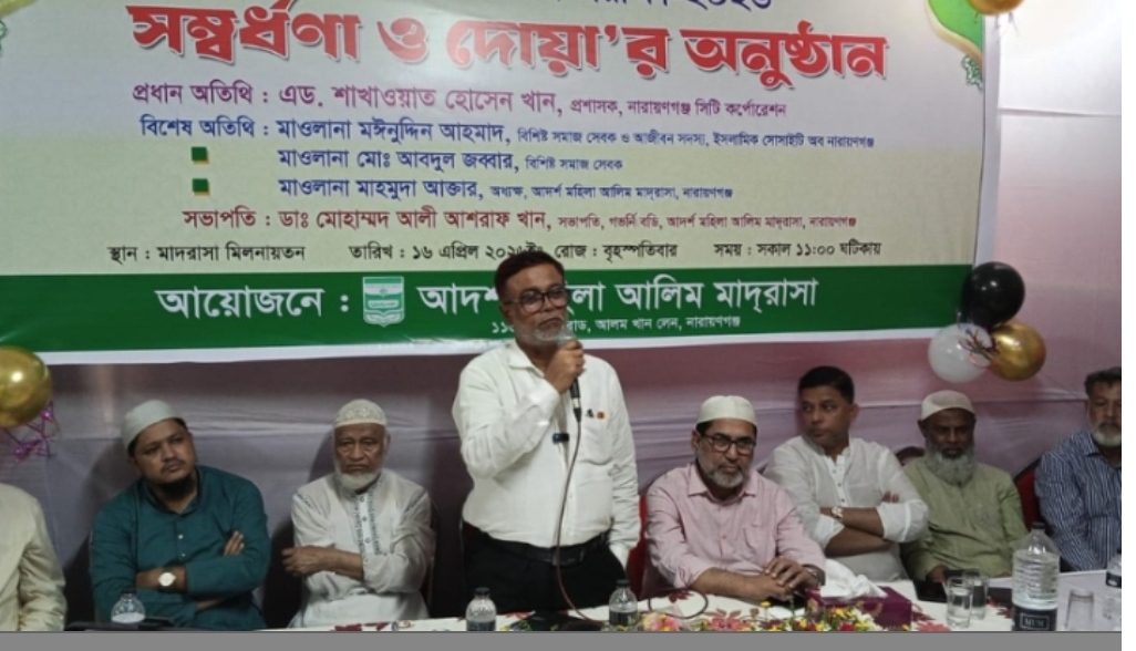 নারায়ণগঞ্জ শহরের আলম খান লেন এলাকায় অবস্থিত নারায়ণগঞ্জ আদর্শ মহিলা আলিম মাদরাসায় ২০২৬ সালের দাখিল ও আলিম পরীক্ষার্থীদের সংবর্ধনা ও দোয়া মাহফিল অনুষ্ঠিত হয়েছে।