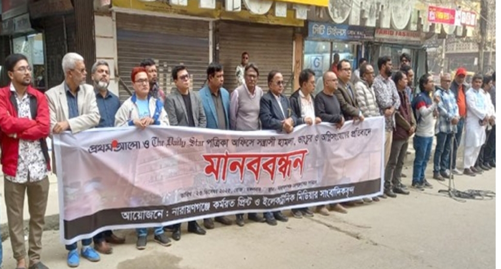 মঙ্গলবার সকাল ১১টায় নারায়ণগঞ্জ প্রেস ক্লাব চত্বরে প্রথম আলো ও ডেইলি স্টার পত্রিকা অফিসে হামলা, ভাঙচুর ও অগ্নিসংযোগের প্রতিবাদে আয়োজিত মানববন্ধন কর্মসূচিতে তারা এসব কথা বলেন
