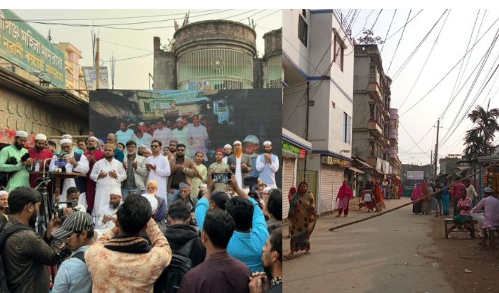 মঞ্চের কারণে দোকানপাটও বন্ধ রাখতে হয়েছে বলে অভিযোগ করেন স্থানীয় ব্যবসায়ীরা।