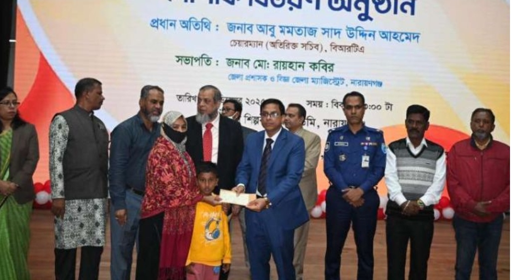 নারায়ণগঞ্জ জেলায় সড়ক দুর্ঘটনায় নিহত ও আহতদের পরিবারের মাঝে বাংলাদেশ সড়ক পরিবহন কর্তৃপক্ষের (বিআরটিএ) ট্রাস্টি বোর্ডের পক্ষ থেকে চেক ও পেশাদার গাড়িচালকদের জন্য নতুন পোশাক বিতরণ করা হয়েছে।