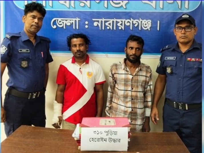 সিদ্ধিরগঞ্জ থানা পুলিশ কর্তৃক অভিযানে ৩১০ পুরিয়া হেরোইন এবং মাদক বিক্রির নগদ ১৫ হাজার ৪৮০টাকাসহ দুই ব্যক্তিকে গ্রেপ্তার করা হয়েছে। রোববার রাতে সিদ্ধিরগঞ্জ থানাধীন গোদনাইলে এই অভিযান চালানো হয়।সোমবার (১৩ অক্টোবর) তাদের বিজ্ঞ আদালতে প্রেরণ করা হয়েছে।